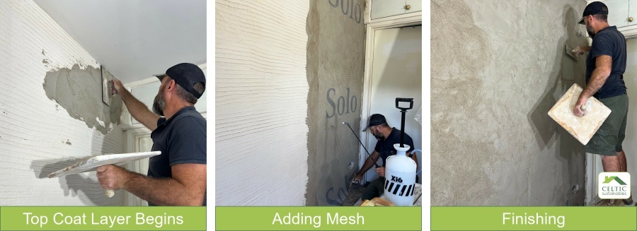 Glyn said, "The SuperTherm held its form perfectly. Che followed the instructions to the letter, and I misted the wall regularly during the days the plaster was curing. When we looked closely, there was a small fine line crack in the very first section that Che had applied, but that first batch was applied when Che was learning about the consistency and application. So, the first parts were always going to be about trial and error. It will be totally covered by the mesh and top-coat and is so tiny it won’t be an issue".